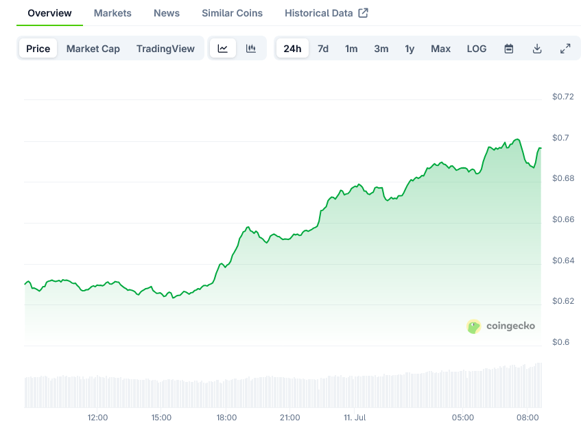 该代币当前交易价格为0.626美元,较7月初0.536美元的低点上涨17%。这一复苏出现在比特币达到113,000美元并带动整个加密市场之际。