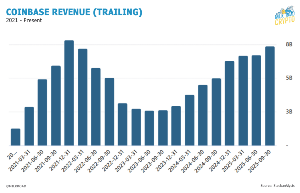 Coinbase已连续五个季度实现营收增长,同时将运营支出控制在上一周期水平之下。销售额增长与严格的支出管理共同构筑了比2021年行业支出激增时期更稳健的财务基础。Milk Road数据显示,在经历2022-2023年低迷期后,公司营收正快速回升至2021年末水平。