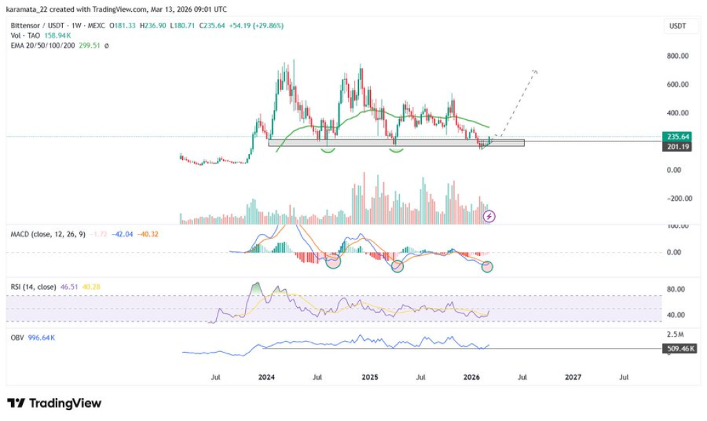 在分析师早先指出的技术形态确立后,伴随一波强势行情,Bittensor价格再度成为市场焦点。TAO价格在长期盘整区间反弹后,近期已攀升至235美元区域。此前数周的横盘整理使资产价格始终局限在一个宽幅区间内。当前的市场表现引发了更广泛的疑问:在本轮周期中,Bittensor价格究竟能上涨到多高?