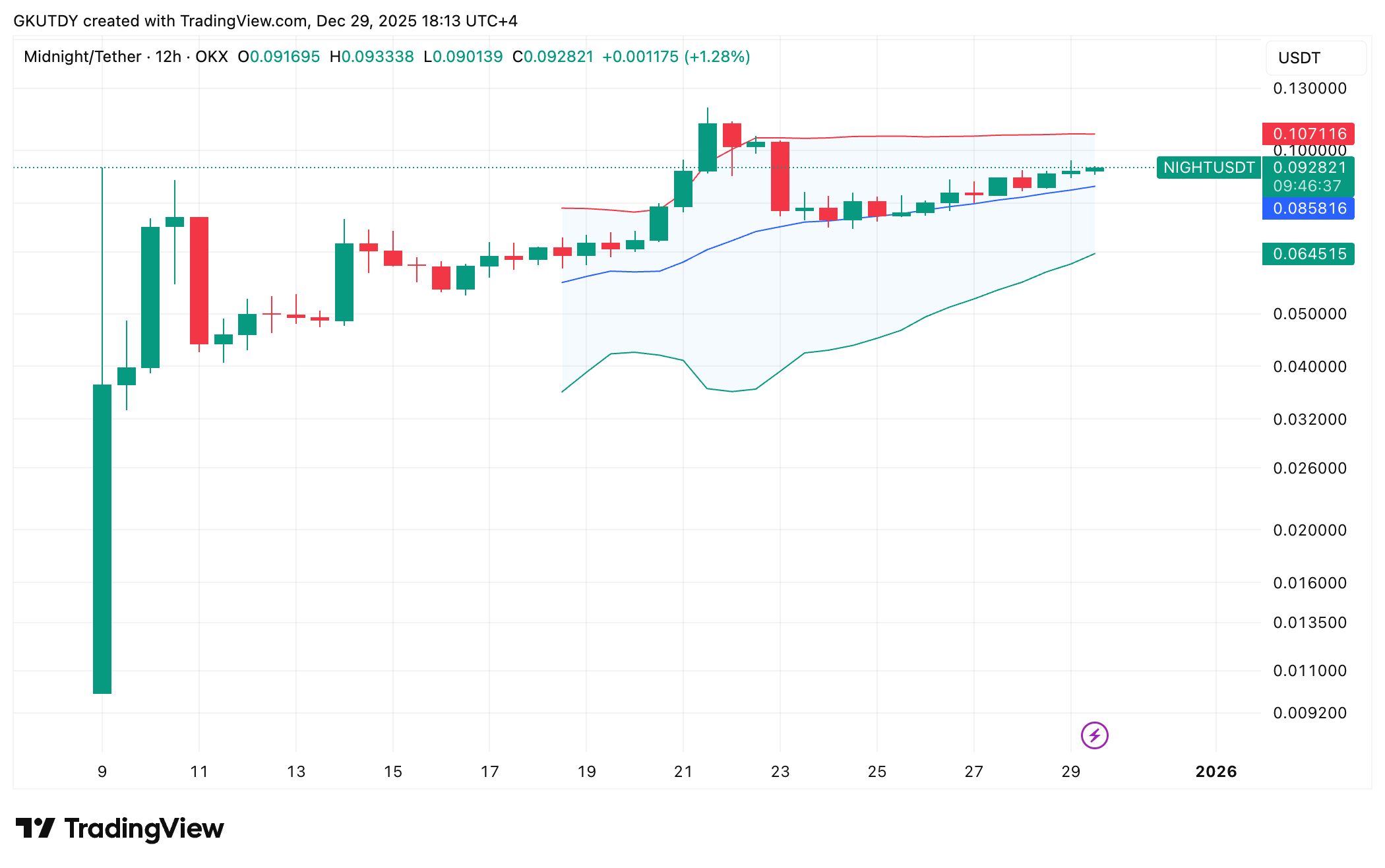 根据TradingView的NIGHT/USDT图表,最新K线显示价格为0.092216美元,涨幅2.67%。当前涨势建立在价格稳守布林带中轨0.085786美元之上的基础之上,这项广受欢迎的技术指标通常能持续支撑趋势直至突破发生。
