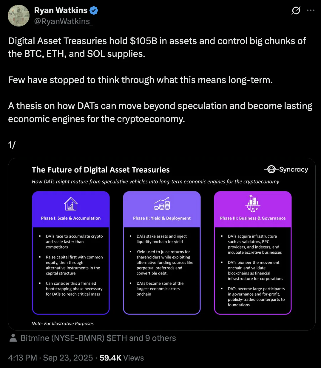 加密国库(或称数字资产国库)已不再是装满比特币和以太坊的保险库。Syncracy Capital联合创始人Ryan Watkins指出,这些机构合计持有约1050亿美元的代币,而他们运用这些资产的方式正在改变游戏规则。