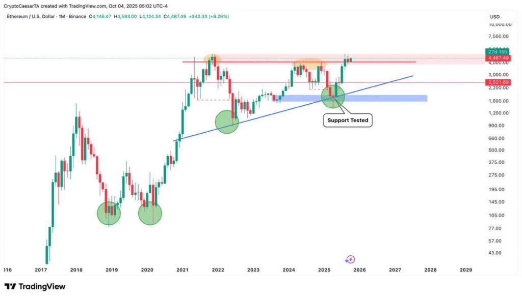 以太坊($ETH)在机构资金强力支撑下表现坚挺,现交投于4500美元附近。分析师指出,若成功突破4750美元阻力位,将打开冲击历史高点(ATH)的通道。