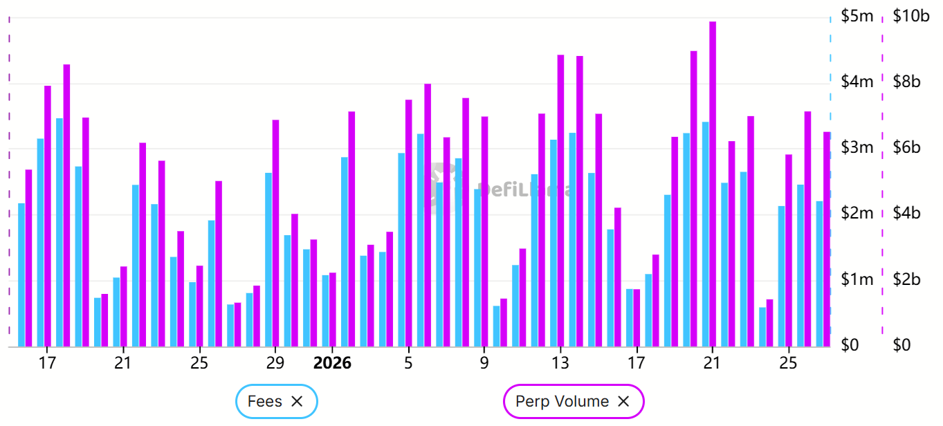 部分市场参与者将HYPE的价格上涨归因于Hyperliquid链上活动的增加,尽管其合成永续合约交易量与手续费未见显著变化。截至周二,Hyperliquid未平仓合约总额为85亿美元,与一周前基本持平。除白银合约活动增加外,尚无证据表明平台使用情况发生重大转变。