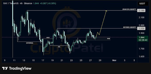 近期技术分析表明,RAY的四小时图表在1.844美元处呈现明显的公允价值缺口(FVG)回补,同时伴随决定性的市场结构转变(MSS)。这种形态预示着新的买入兴趣和看涨结构的潜在延续。只要价格保持在1.664美元无效位上方,该结构就保持有效,风险参数明确。