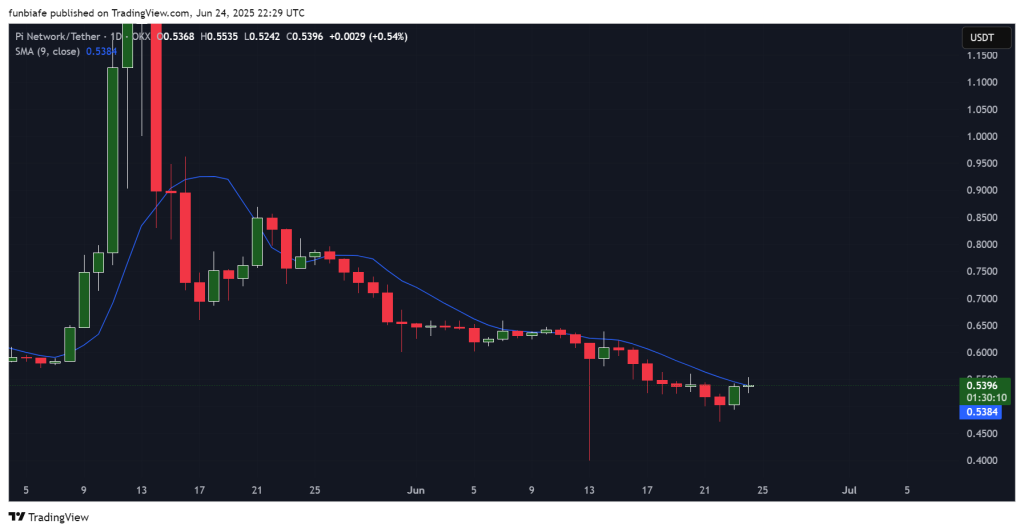 经历数周下跌后,Pi币价格首次站上9日移动平均线(当前交易价0.5422美元)。虽然释放出可能的转势信号,但多数技术指标仍显示看跌趋势。目前Pi币仍处于关键阻力位下方,尚未确认有效突破,过去24小时涨幅仅1.09%。