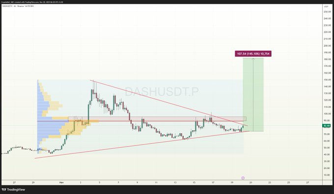 DASH在一个由更低的高点和更高的低点驱动的对称三角形内交易。该形态经过数周的压缩后形成,价格趋向均衡。这种结构反映出市场正在为决定性突破做准备。