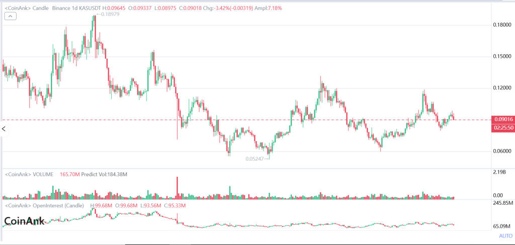 市场走势完全印证了这一判断。KAS价格始终未能站稳0.10美元上方,目前仍在该区间横向整理。今日低点已下探至0.089-0.090美元区域,正逼近我们警告的下方危险边界。