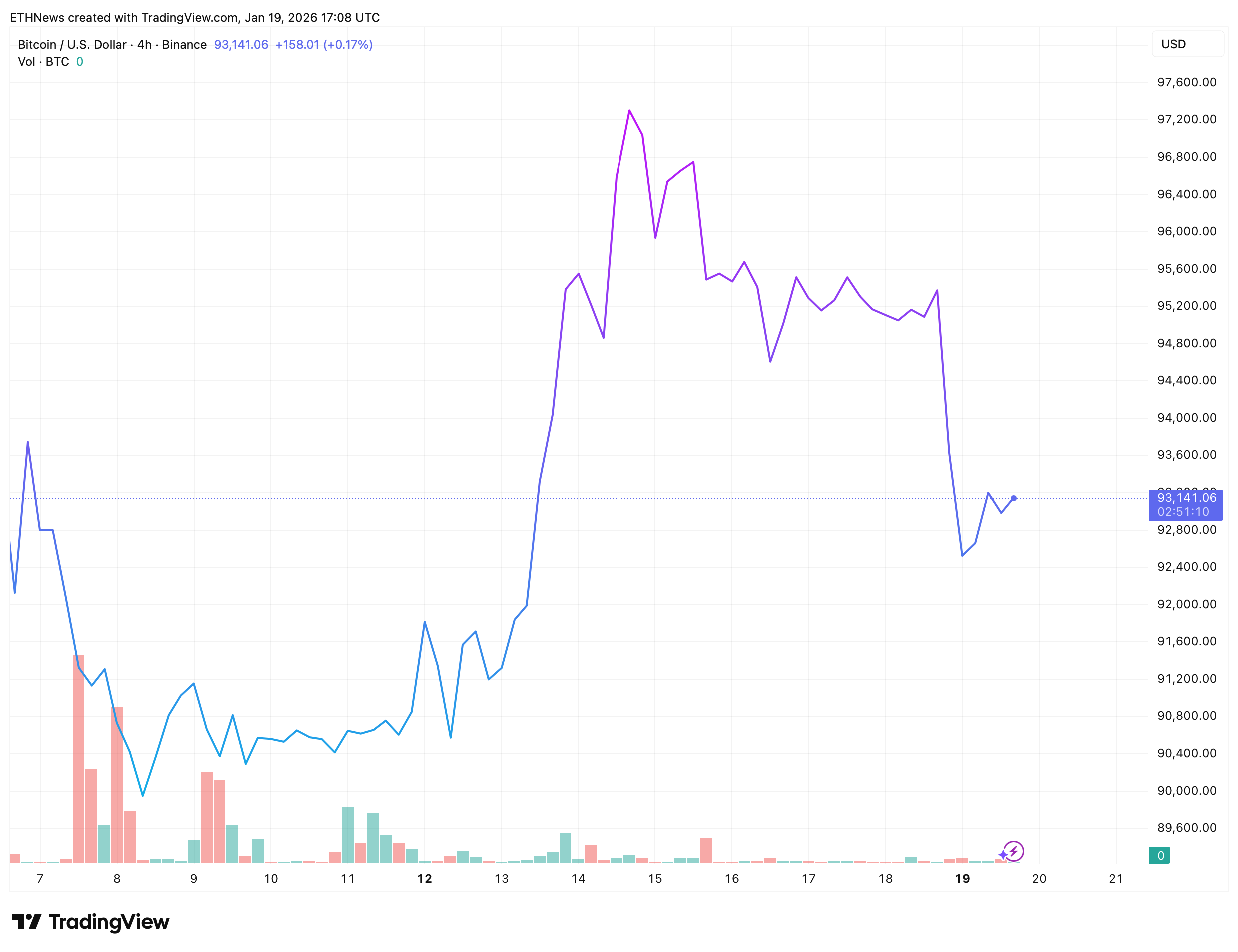 在4小时图表上,BTC目前交易价格约为93,100美元,在从近期高点快速回落后小幅反弹。