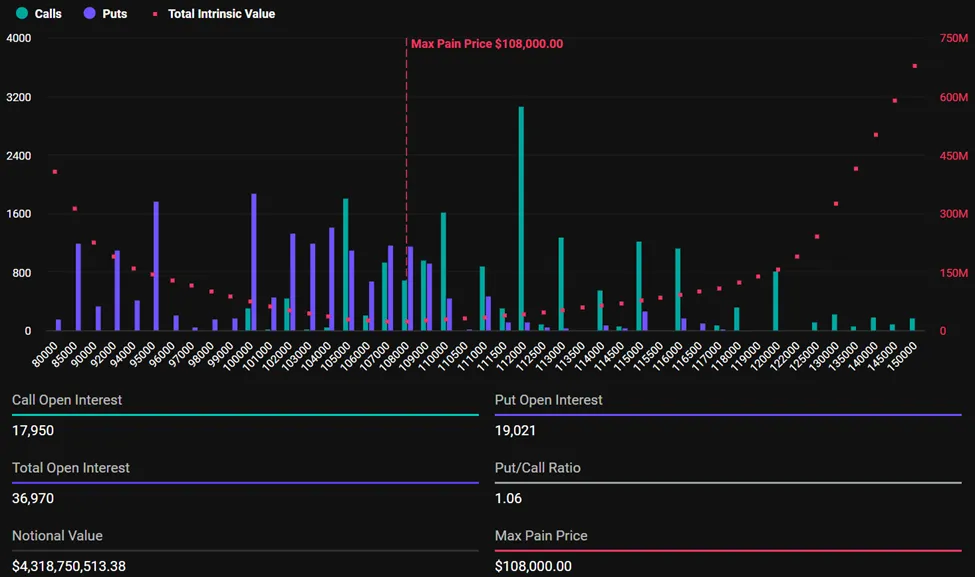 Deribit数据显示,今日将有价值超过50.3亿美元的比特币和以太坊(ETH)期权到期。其中比特币到期期权名义价值达43亿美元,未平仓合约为36,970份。看跌/看涨比率为1.06,今日到期比特币期权的最大痛点价位为108,000美元。