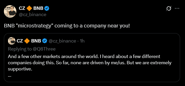 随后他又发布了一条提及迈克尔·塞勒公司的推文:"BNB版'微策略'即将来到你身边的公司!"他开玩笑说BNB可能成为下一个获得上市公司如此关注的代币。这家以对比特币下重注闻名的公司已投入数十亿美元购买比特币。