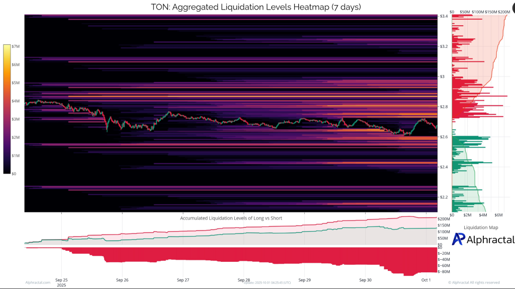 过去7天TON交易区间为2.50-3.40美元,其中2.70-3.00美元附近存在密集清算区。期间空头清算额突破1.5亿美元,而多头清算额维持在6000万美元以下。