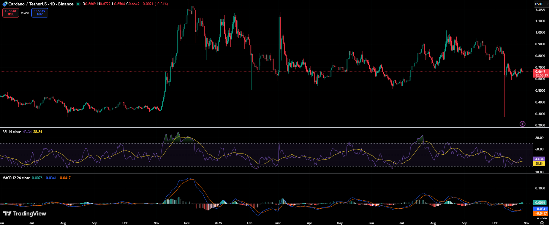 此次升级正值ADA结束数月横盘整理、技术形态出现看涨反转信号的关键节点。截至发稿时,该代币价格徘徊在0.66美元附近,处于近期波动区间的中位。尽管整体市场情绪仍显谨慎,但卡尔达诺的价格结构和链上发展表明,年底前出现重大行情变动的可能性正持续增加。