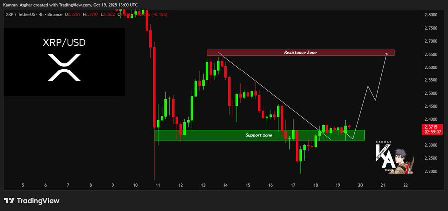 从图表来看,XRP已突破长期盘整区间。撰稿时XRP交易价约2.37美元,支撑位在2.25-2.35美元区间,阻力位在2.60-2.70美元。分析师Kamran Asghar指出该形态"清晰",已确认突破并完成回测。若能持续站稳2.70美元上方,则可能打开通往2.80美元的道路,若动能延续,后续可能进一步向6.50美元的大目标迈进。