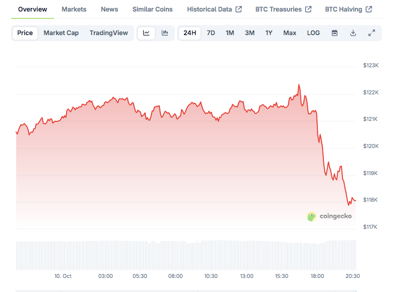 CoinGecko数据显示,比特币现报118,223美元,24小时下跌1.88%,周跌幅达3.7%。抛压与全球股市疲软及加密交易所资金流入放缓同步。