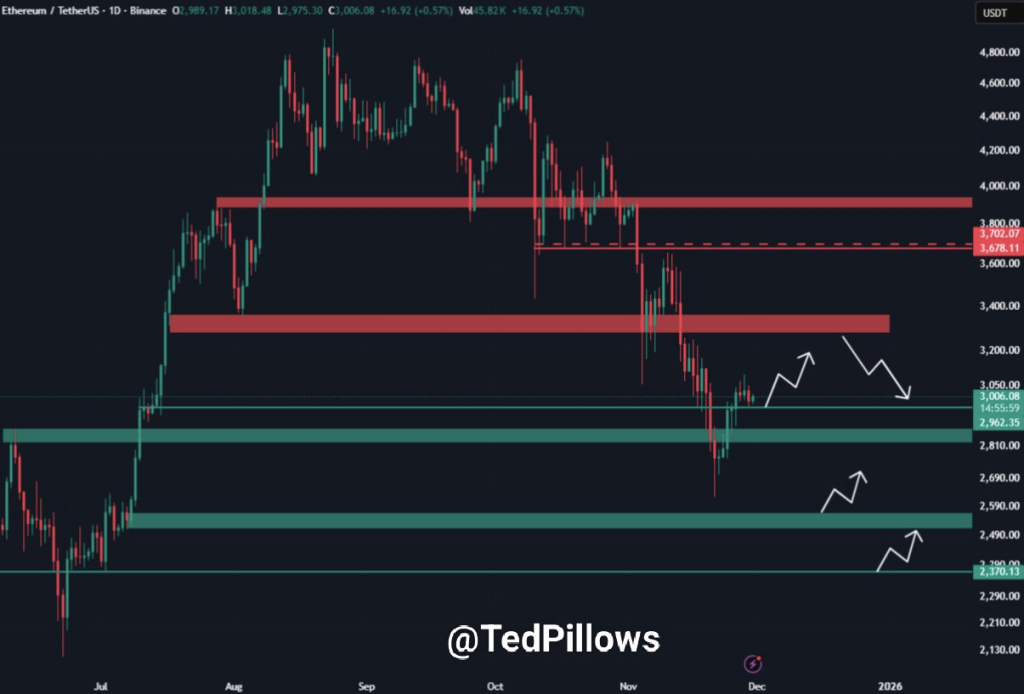 价格走势保持稳定,使以太坊持续处于窄幅震荡区间。分析师Ted指出,3000美元水平已成为市场参与者的关注焦点,若买方能强势防守该区域,则将打开通往3200-3400美元区间的路径。