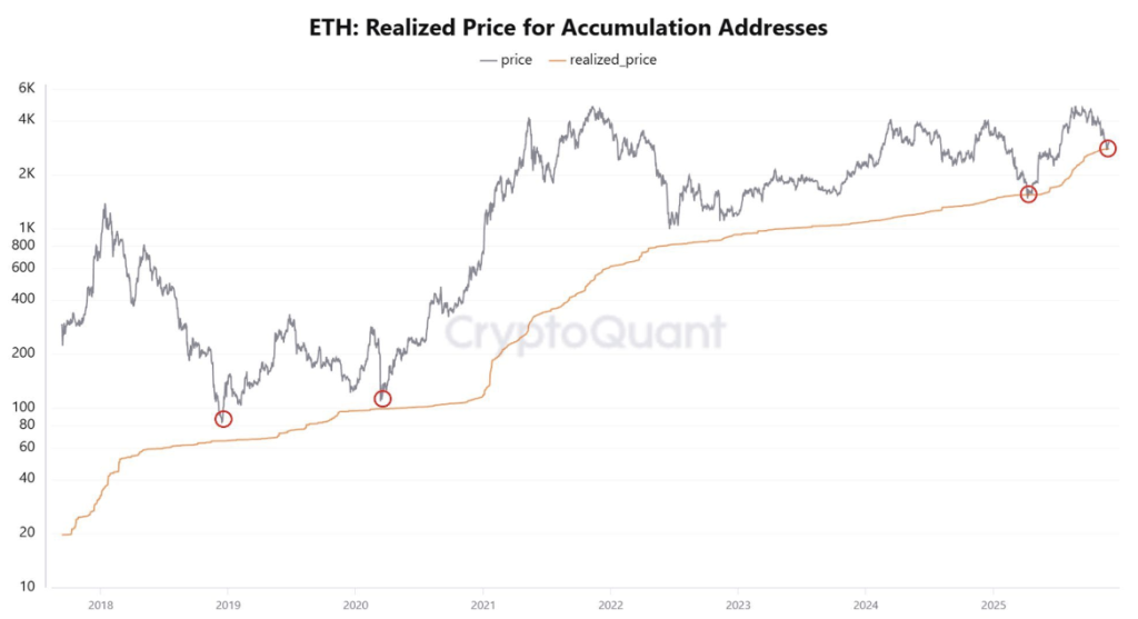 链上数据为以太坊价格行为提供了额外佐证。CryptosRUs强调积累钱包的实际价格区间近期被重新测试,该指标历来与长期持有者的买入行为高度吻合。他将该区域称为“巨鲸利润支撑带”,并披露大额持有者在此价位持续建仓。更重要的是,未见大投资者减仓迹象。