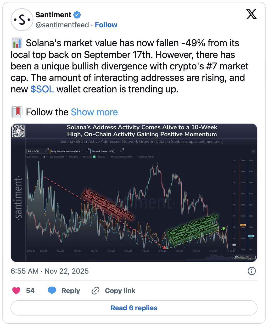 通常情况下价格下跌会伴随网络活动减少,但Solana呈现出相反景象。Santiment将此情形解读为“终极强劲转向信号”。尽管价格走势下行,用户数量的增长表明投资者对该项目持续保持兴趣,暗示可能出现方向性转变。