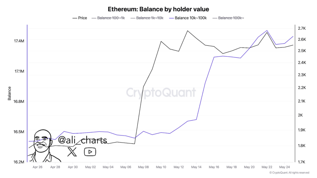 CryptoQuant数据显示,持有1万至10万ETH的鲸鱼钱包在5月8日以来悄悄增持100万枚ETH,持仓量从1640万枚增至1740万枚。分析师Ali指出,这些积累行为发生在以太坊月涨幅稳定保持51%的背景下。