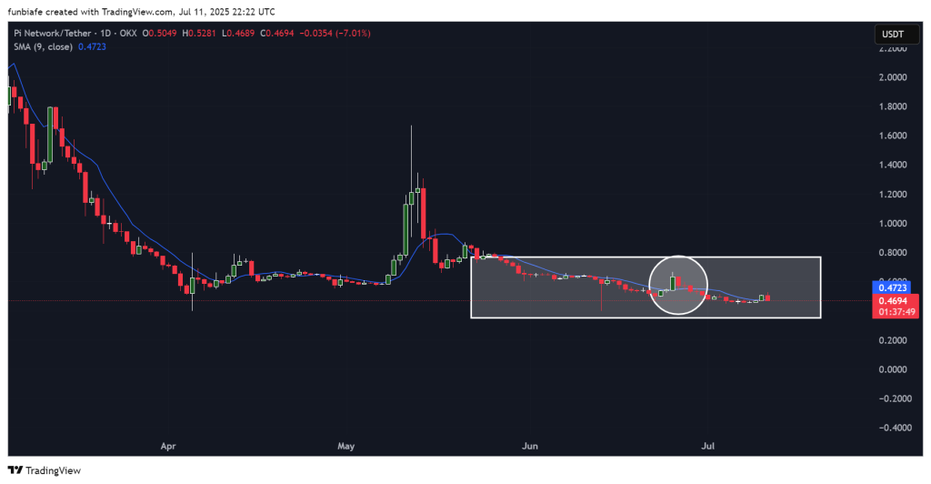 自六月初以来,Pi币价格始终在0.40至0.55美元区间波动。六月中旬虽短暂冲高至0.75美元,但次日即回落至原有区间。截至目前,这一箱体震荡格局仍在延续。