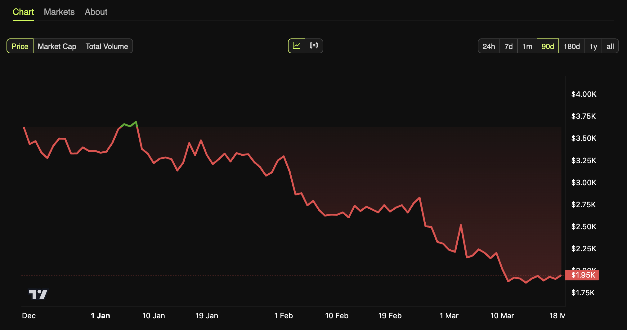 这一展望出现在以太坊面临严峻市场条件的背景下。自2024年底以来,以太坊一直处于持续下跌趋势中。事实上,仅在过去一个月里,该替代币的价值就缩水了29.4%。截至撰写本文时,以太坊在过去的24小时内交易价格上涨。