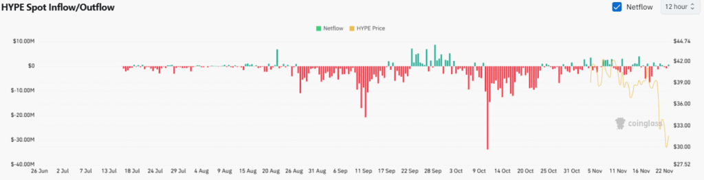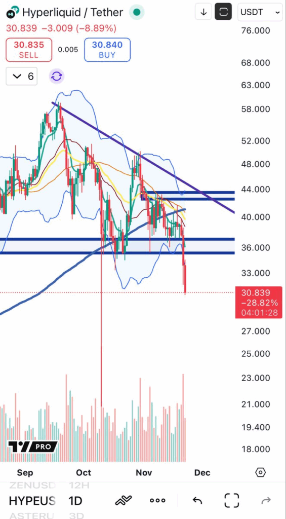 截至撰稿时,HYPE交易价格为31.49美元,日内跌幅6.22%。周线录得18.53%的回调。这些数据与价格进入更深度区间时的动量转变相符。
