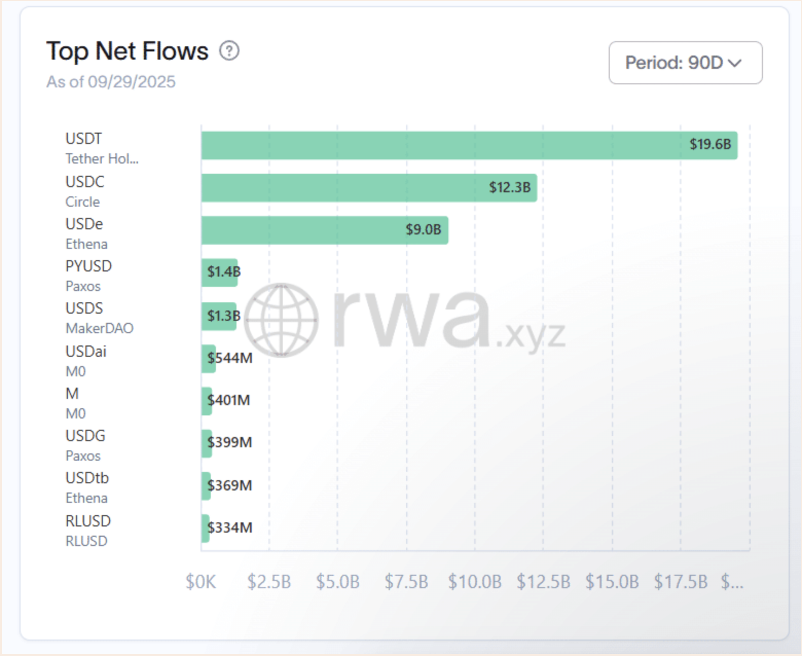 过去90天流入稳定币市场的资金超过460亿美元,其中USDT以196亿美元居首,USDC以123亿美元紧随其后。Ethena发行的USDe表现尤为亮眼,较上季度新增90亿美元。PayPal的PYUSD和MakerDAO的USDS合计吸纳超10亿美元。值得注意的是,这些资金主要聚集在以太坊生态,该网络承载着2970亿美元稳定币总市值中的1710亿美元。波场链以760亿美元份额位居第二,而Solana、Arbitrum和BNB链的规模均不足300亿美元。