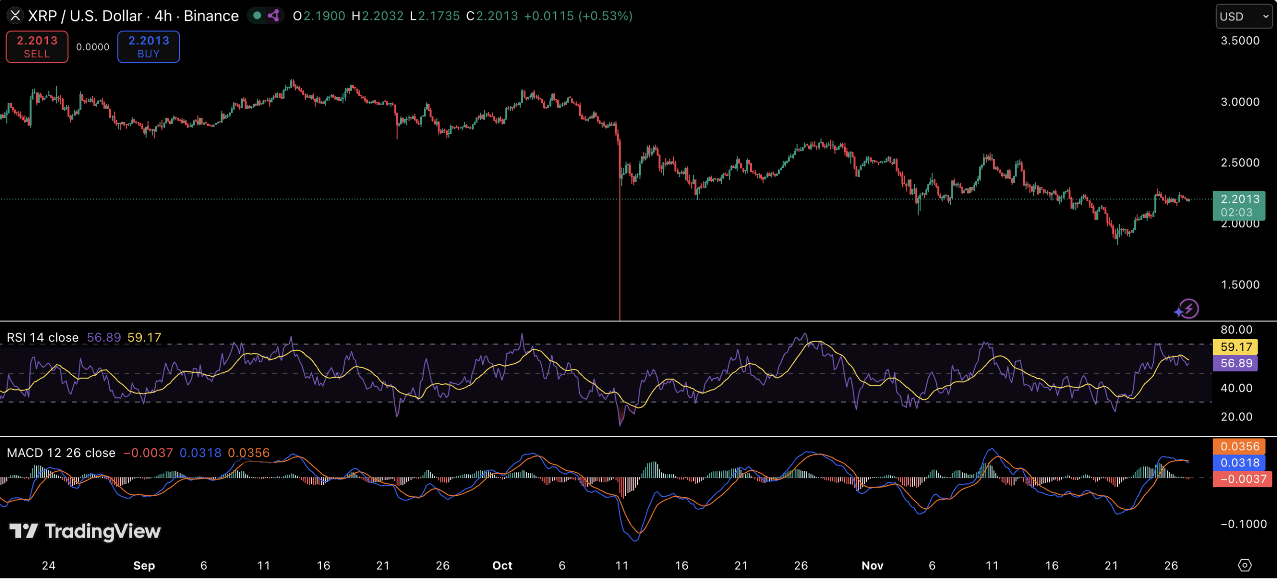 截至撰稿,XRP交易于2.19美元附近,24小时内微幅上涨。4小时图表显示: