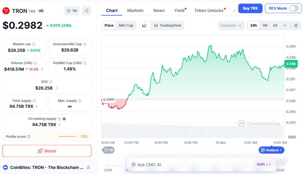 TRX价格预测引起市场关注,因波场币(TRX)正交易于0.300美元阻力位附近。该代币近期在0.298美元附近波动,呈现小幅日涨幅与稳定的市场活动。交易员将此价格区域视为可能影响短期走势的关键水平。