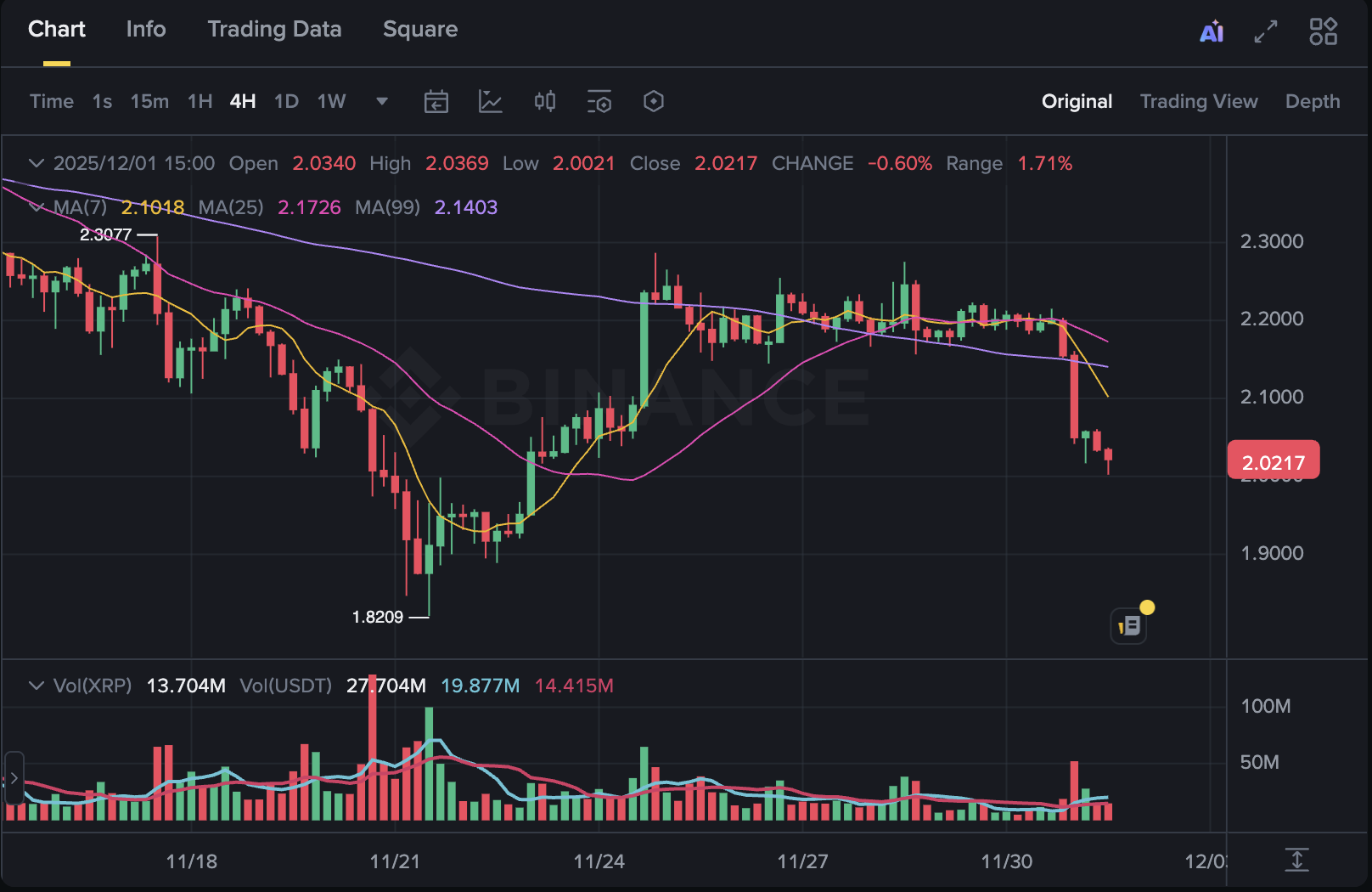 近期XRP受到加密市场整体抛售潮的显著影响。经历11月剧烈波动后,市场情绪尚未完全恢复,给XRP带来压力。过去24小时内XRP价格下跌超7%,现报约2.03美元;周线跌幅约1.3%。