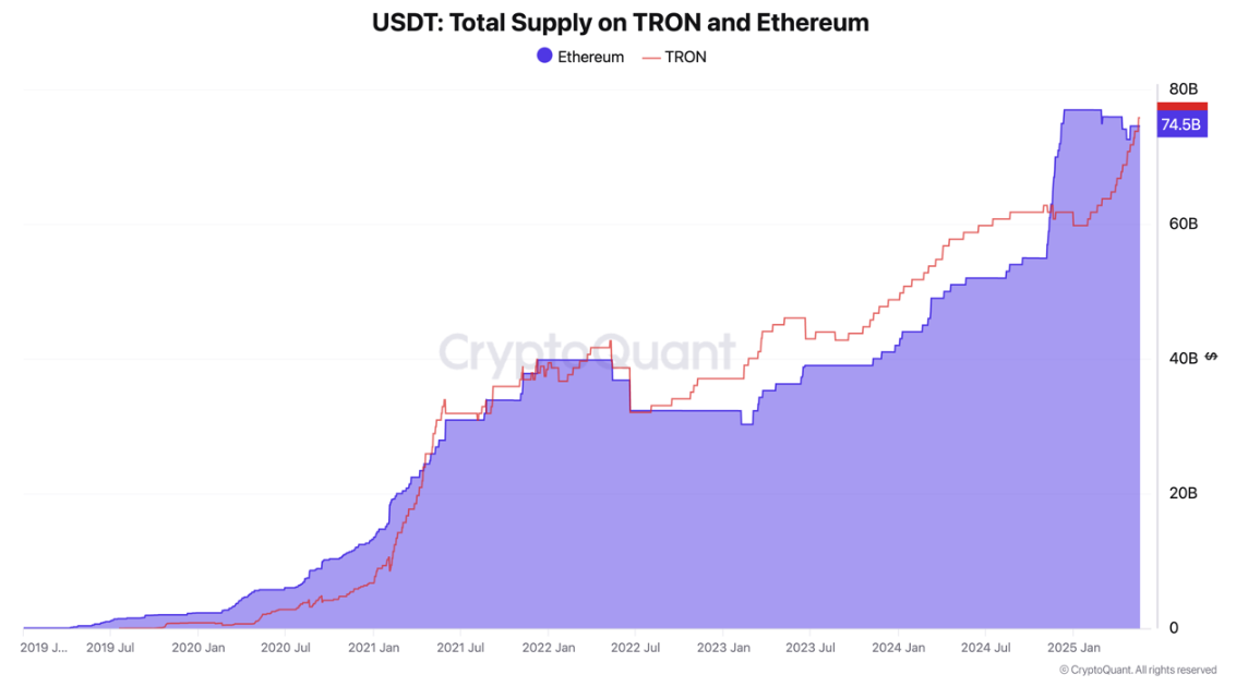 “确实,波场在2025年USDT供应增长方面出现了显著加速(+27%或约160亿美元),超过了以太坊。根据最新数据,波场上的USDT供应量大于以太坊,总计758亿美元,”CryptoQuant表示。