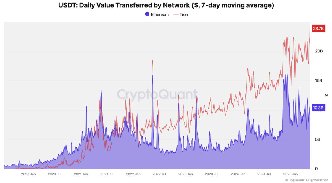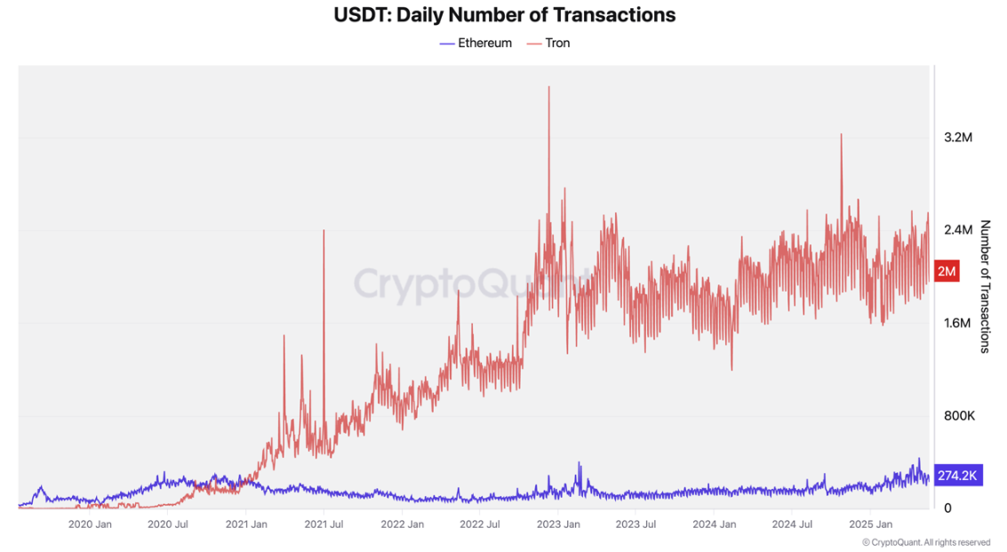 波场的优势反映了稳定币经济中更广泛的转变。曾经被认为是以太坊原生的USDT在波场上蓬勃发展,零售支付、汇款和活动已成为主要增长动力。