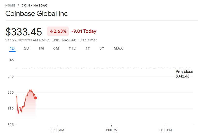 作为美国领先的加密货币交易所,Coinbase股价当前报333.45美元,盘前交易下跌2.63%。