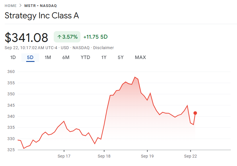 在Michael Saylor领导下,该公司保持激进的比特币收购策略。过去五日股价上涨3.57%,现报341.08美元,市值966.9亿美元。