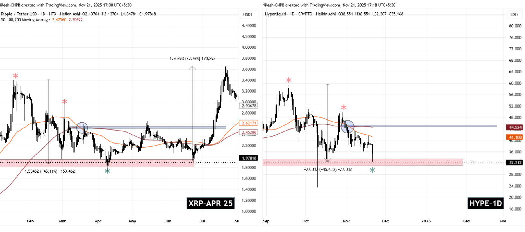 图表右侧的HYPE正在形成几乎完全相同的模式。它已完成类似的45%下跌,下探相近需求区域,经历流动性清洗,并以几乎相同的方式遭遇移动平均线集群的阻力。这种惊人的对称性暗示历史可能重演。