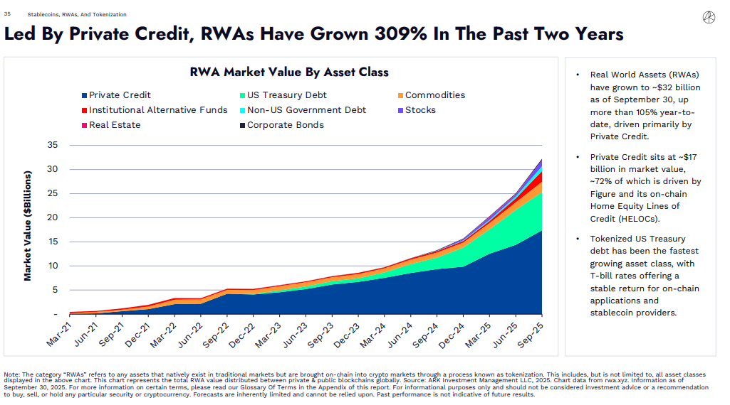 ARK Invest发布的《DeFi季度报告》显示,过去两年间公共区块链上的代币化现实世界资产(RWAs)市场规模暴涨309%。截至2025年9月30日,链上代币化RWAs总价值已攀升至约320亿美元,标志着传统金融资产与去中心化账本技术的融合正在加速。