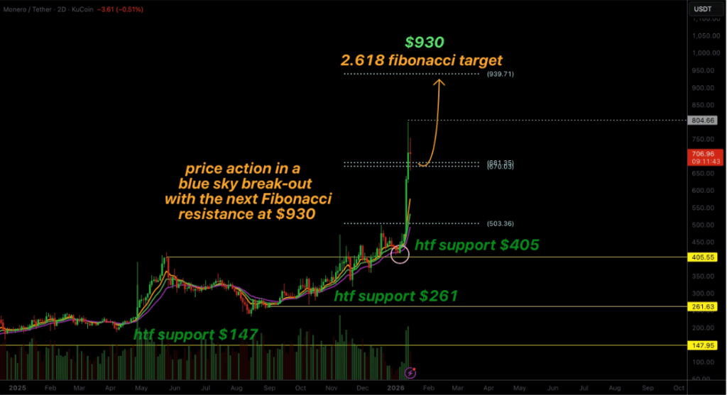 门罗币在稳固收复670美元斐波那契延伸位后保持上升动能。该加密货币目前已进入突破发展阶段,交易价格处于历史关键阻力位上方,且上方抛压有限。该价位上方的强劲价格表现已将前期阻力转化为支撑,为后续上涨奠定基础。