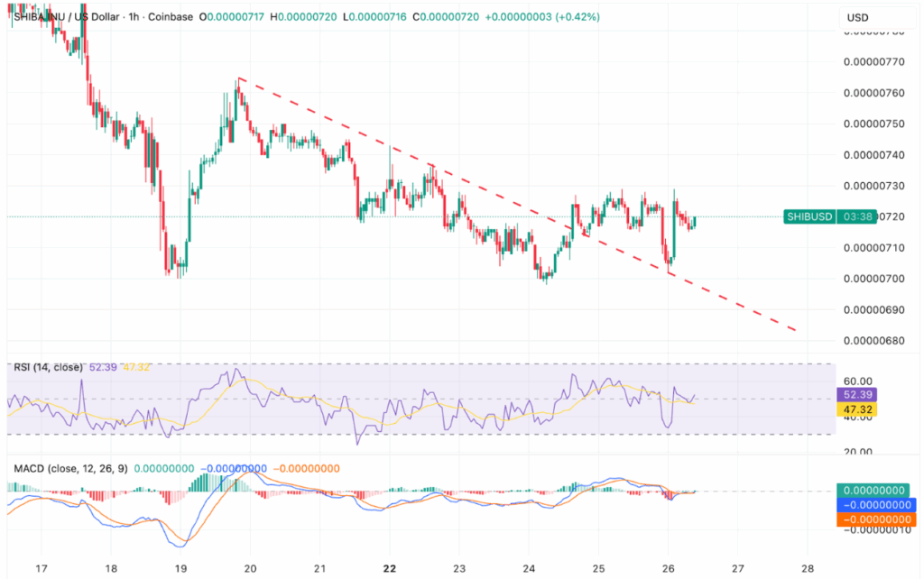 在日内图表上,SHIB在本周初大幅下跌后,一直在0.00000710美元上方横盘整理。尽管曾短暂突破一条短期趋势线,但突破缺乏动能且未能维持。