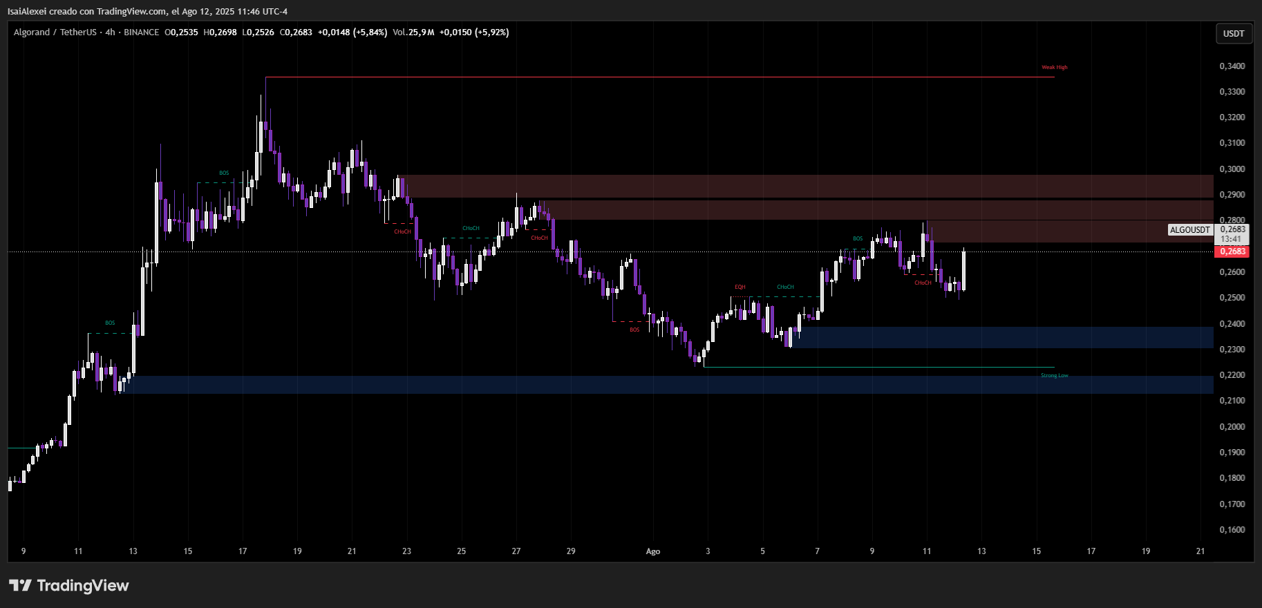 该资产近月累计上涨19.53%,但年内仍下跌21.52%。技术面显示ALGO正从0.25美元支撑位反弹,初步形成潜在头肩底形态,若伴随放量确认突破,或将挑战0.48-0.50美元区间。