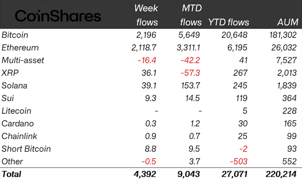 最新数据显示,上周加密货币资金流入达到439亿美元,创下单周历史新高,使年初至今的净流入总额达到270亿美元。当前资产管理规模(AuM)已达到2200亿美元的峰值。