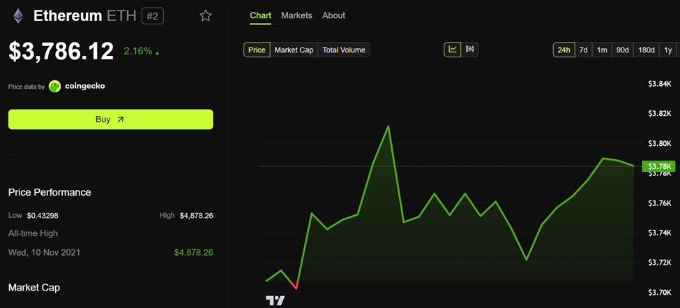 截至发稿时,以太坊交易价格为3786美元,24小时涨幅超2%。