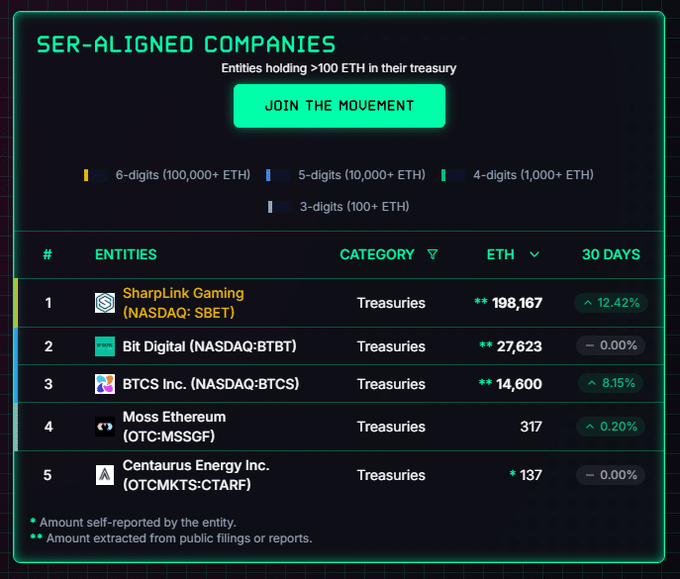 五家大型企业已建立总计24万枚以太坊的战略储备,按当前市值计算约合6亿美元。其中SharpLink Gaming以198167枚ETH持仓位居榜首,Bit Digital持有27623枚,BTCS Inc.储备14600枚。Tom Lee的BitMine宣布计划收购价值2.5亿美元的ETH,可能使当前企业持仓规模翻倍。