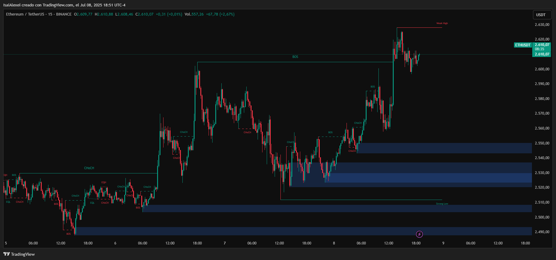 ETH正运行于当前震荡区间上沿,成功收复2600美元阻力位并有望转化为支撑位。下一突破区域位于2650-2730美元区间,该结构阻力可追溯至4-5月的派发区。