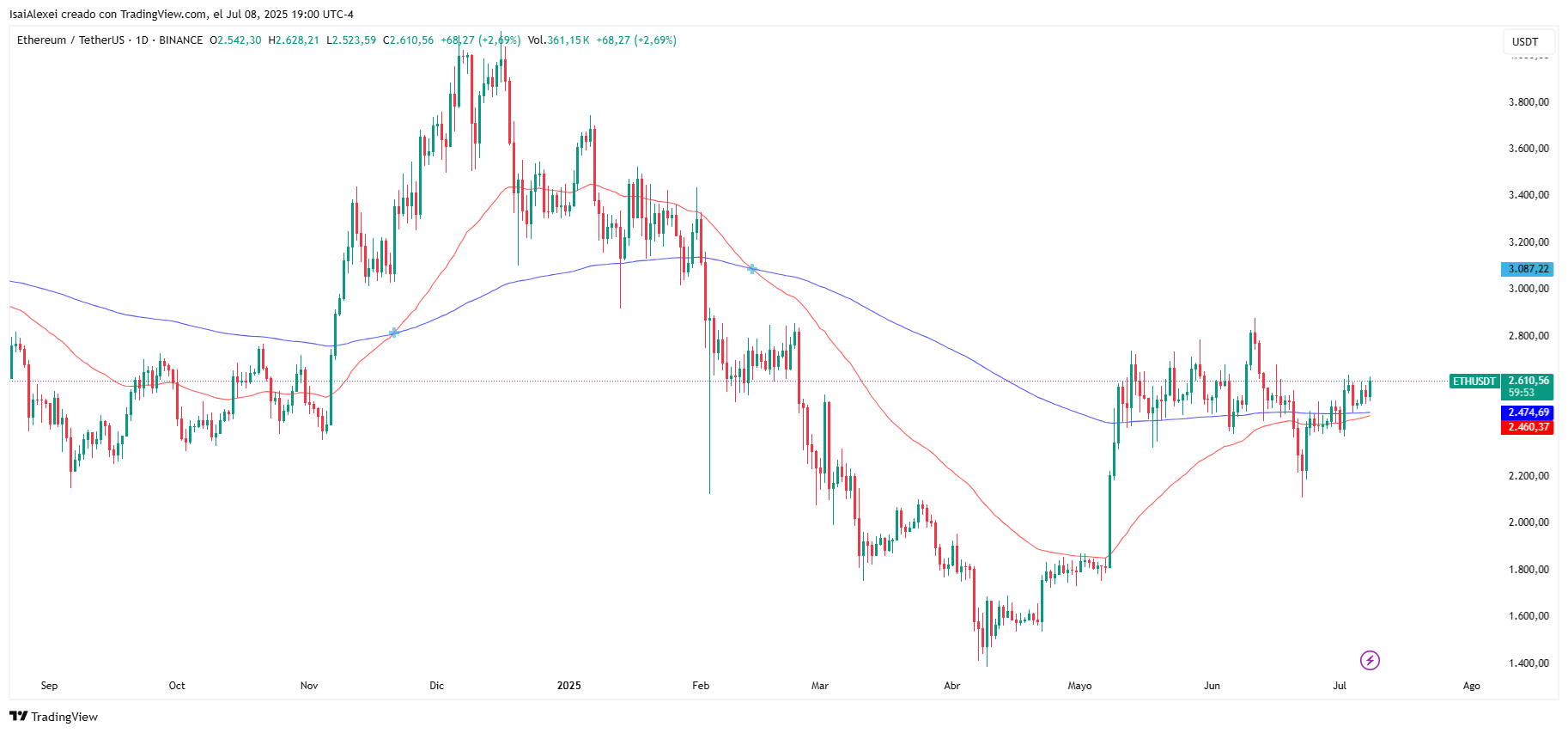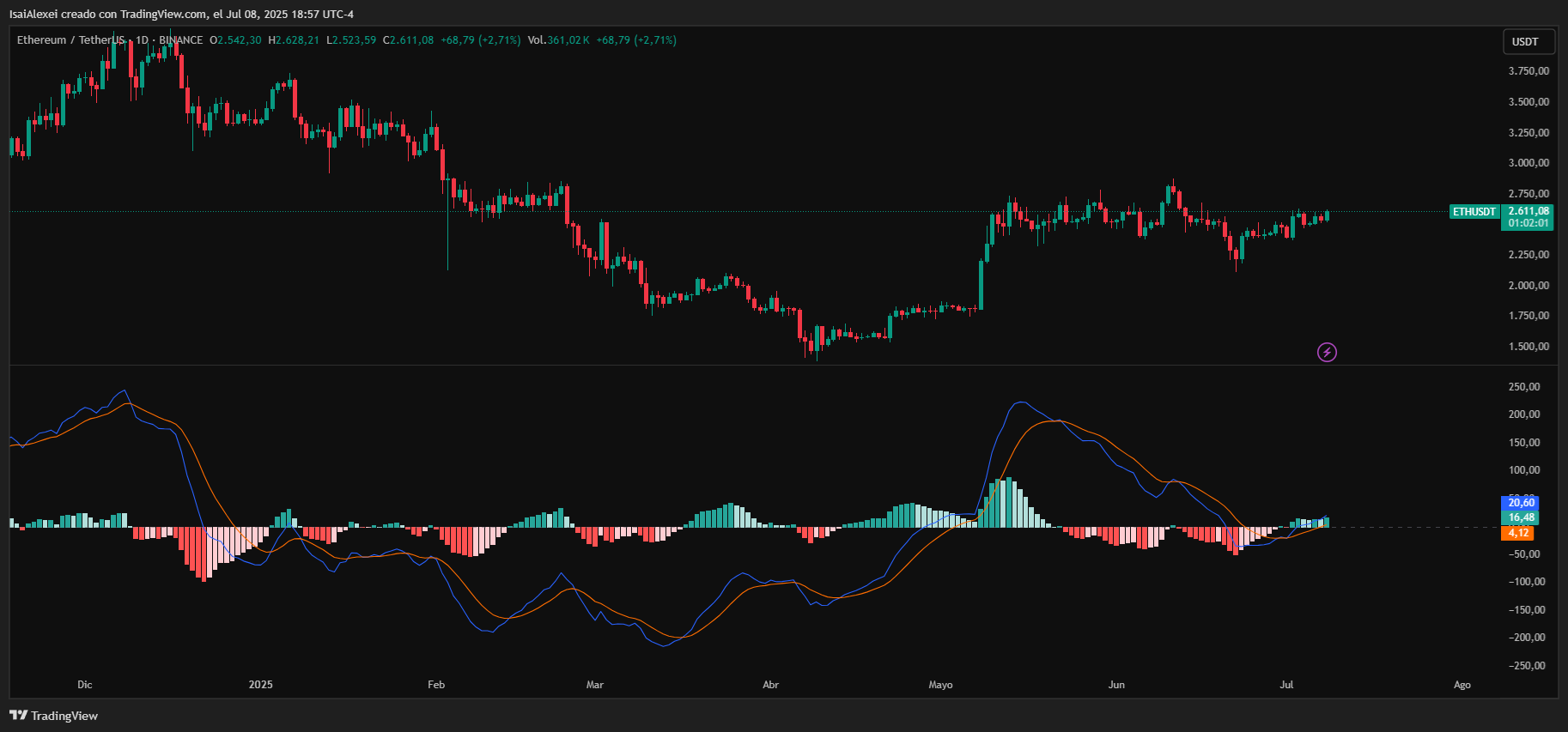 若ETH收于2650美元上方,下一目标位看2800及2960美元;反之若未能守住2560-2540美元支撑,可能回撤至2440美元(对应前期成交量密集区与50日均线)。