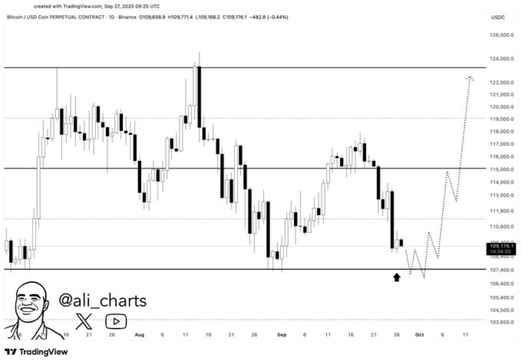 阿里的比特币日线图突显了107,200美元区域的重要性。在从118,000美元上方持续下跌一周后,比特币正在测试该水平。图表展示了从此处可能出现的两种走势。