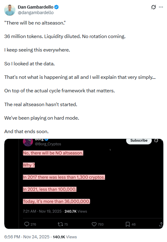 Dan Gambardello针对"山寨币季节不会来临"的论断进行了详细回应。他表示看到大量诸如"不会有山寨币行情、3600万代币、流动性稀释、资金轮动无望"的评论,但在梳理当前市场数据后得出了不同结论。