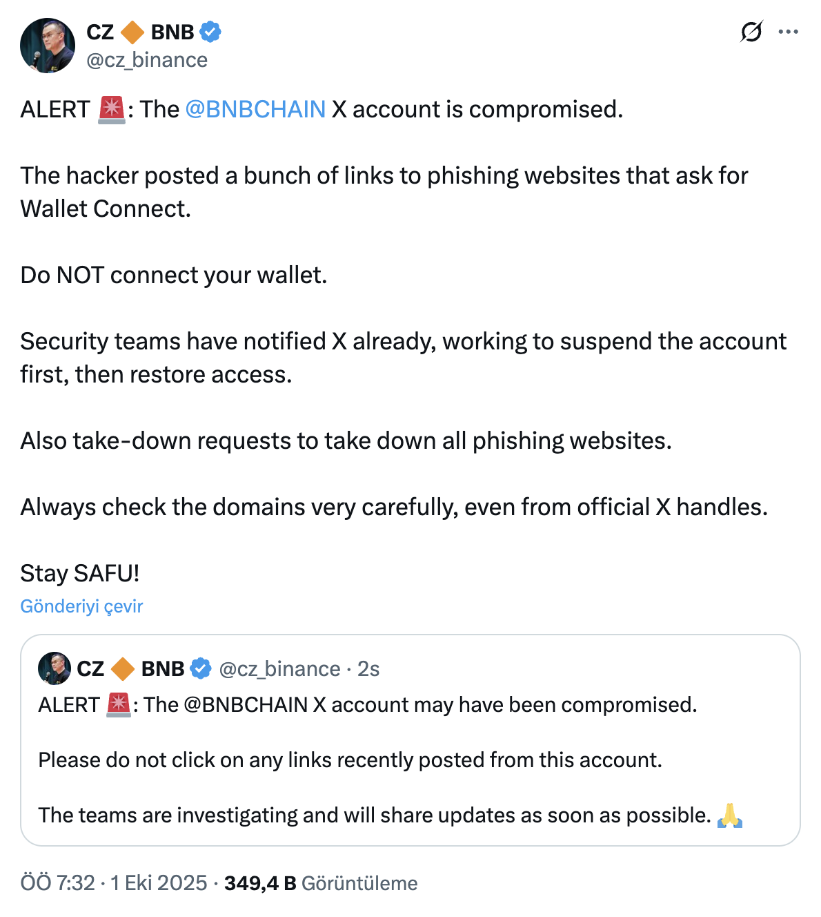 BNBChain官方X账号近期遭遇黑客入侵。攻击者盗用币安创始人赵长鹏的形象推广m美币,并发布虚假空投链接。在BNBChain团队努力恢复账号控制权期间,赵长鹏公开呼吁用户警惕诈骗企图。