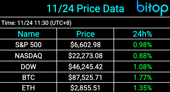 受美联储可能降息及美国官员或允许英伟达向中国销售AI芯片的消息影响,周五市场情绪略有改善。比特币近期表现疲软,周五深夜一度跌至80,600美元低点,较10月高点下跌36%。加密货币总市值已跌破3万亿美元,恐惧与贪婪指数仍徘徊在极端恐惧水平。截至发稿,比特币周末缓慢回升至87,000美元附近,以太坊(ETH)也小幅上涨至2,800美元上方。