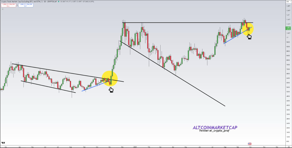 剔除比特币和以太坊的加密货币总市值(TOTAL3)在测试1.12万亿美元趋势线后,目前仍维持在1.09万亿美元上方。若能重新站上该关键位,近期下跌可能被确认为假突破,或将触发上涨行情。