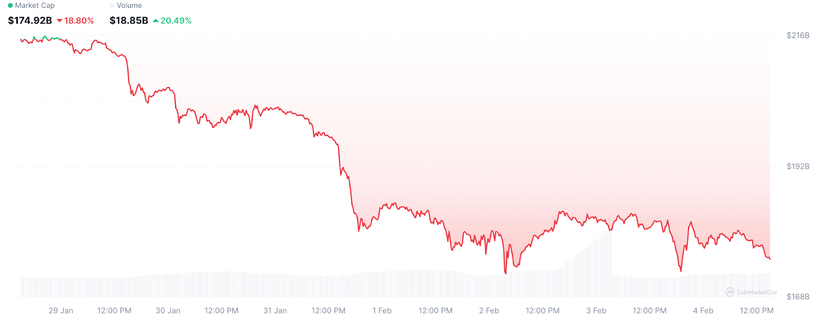 本周,BNB Chain生态未能抵御整体市场的下跌趋势,反而经历了近期历史上最为剧烈的周环比跌幅之一,市值单周蒸发440亿美元,周环比跌幅达18.8%。