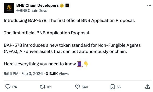 AI智能体新标准BAP-578发布:BNB Chain推出了针对"非同质化智能体"的新标准BAP-578。该标准使得AI智能体能够拥有链上钱包并执行自主交易,为去中心化的"智能体经济"铺平了道路。